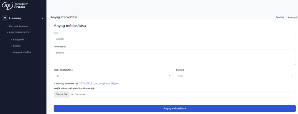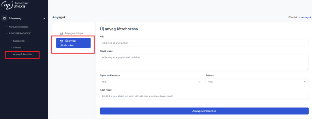 Új anyag létrehozásánál eldönthetjük, hogy az egy link (url), videó (beágyazandó videó) vagy fájl (letölthető tartalom) legyen.