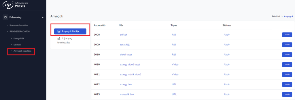 Az egyes előadásokhoz n számú anyagot (csatolmányt) lehet hozzá rendelni, melyek kezelése az alábbi menüpontban történik. Ez a több a többhöz viszont visszafelé is igaz, egy létrehozott aktív státuszú csatolmányt bármennyi előadáshoz hozzá lehet rendelni.