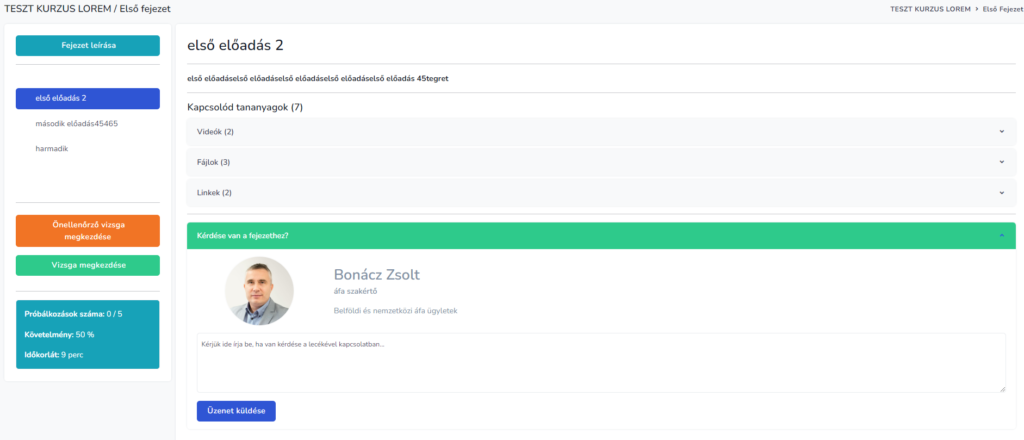 Itt találhatóak a fejezet alap adatai, a fejezhez tartozó előadások és az előadásokhoz tartozó anyagok (csatolmányok). Az egyes előadásokhoz a fejezethez jelölt szakértőhöz közvetlen kérdésbeküldési lehetőség van.